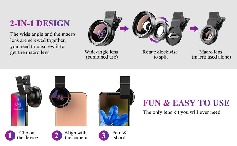 - 【0.45X Wide Angle Lens】 To use the wide angle, simply attach both lenses together.With the 0.45X Super Wide Angle, it can makes your world bigger and wider and brighter.Opens up your field of view for breathtaking landscape photos or selfies.Fit the entire family or the whole team intothe picture.