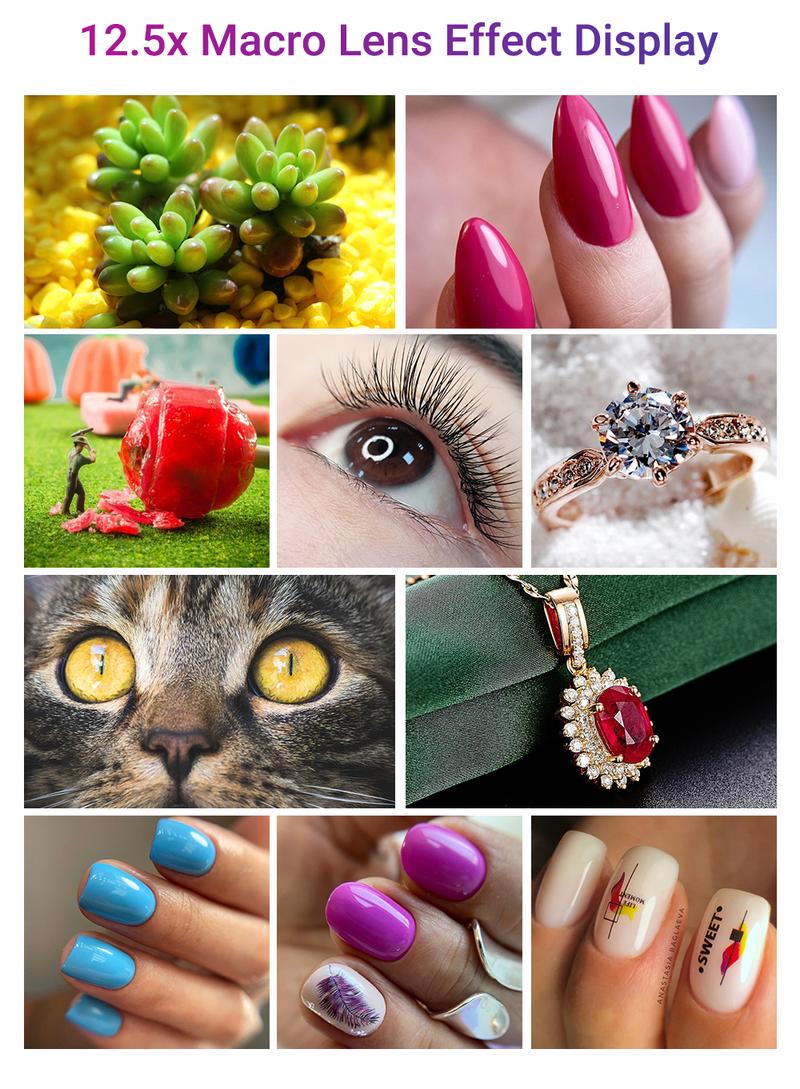 - 【12.5X Macro Lens】To use the macro lens, simply unscrew the wide angle lens.Gets you 12.5X closer to your subject for extreme close-ups.Explore nature with a massive 12.5X macro magnification,with anoptimum macro distance of 0.8 to 1.6" (2-4cm), it's perfect for close-up shots of insect, jewelry, coins, plant and more.